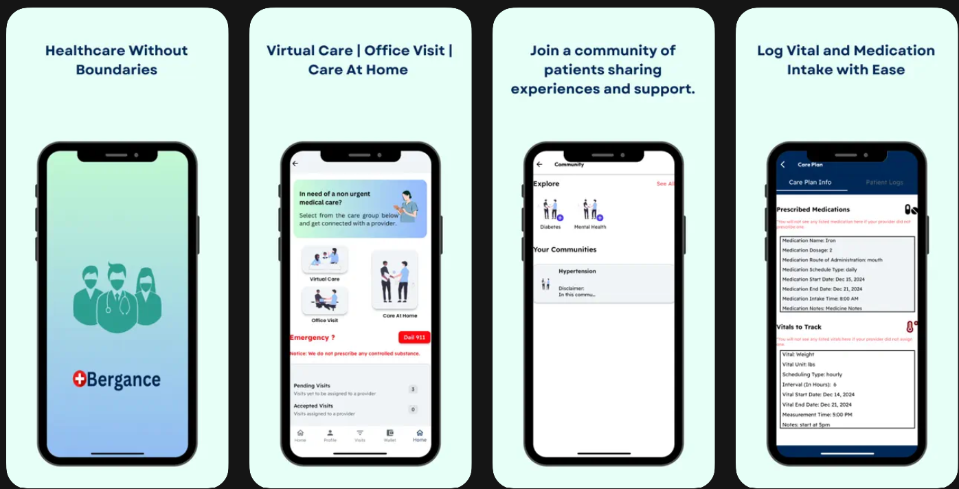 Bergance bridges the gap by offering a wide range of services through a unified platform: virtual consultations, office-based visits, and home-care appointments. It also supports remote monitoring of vitals, personalized care plans, and a community-care network for peer support, all aimed at making healthcare easy and inclusive.